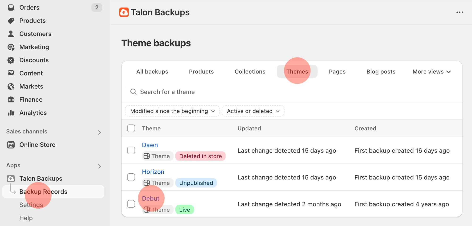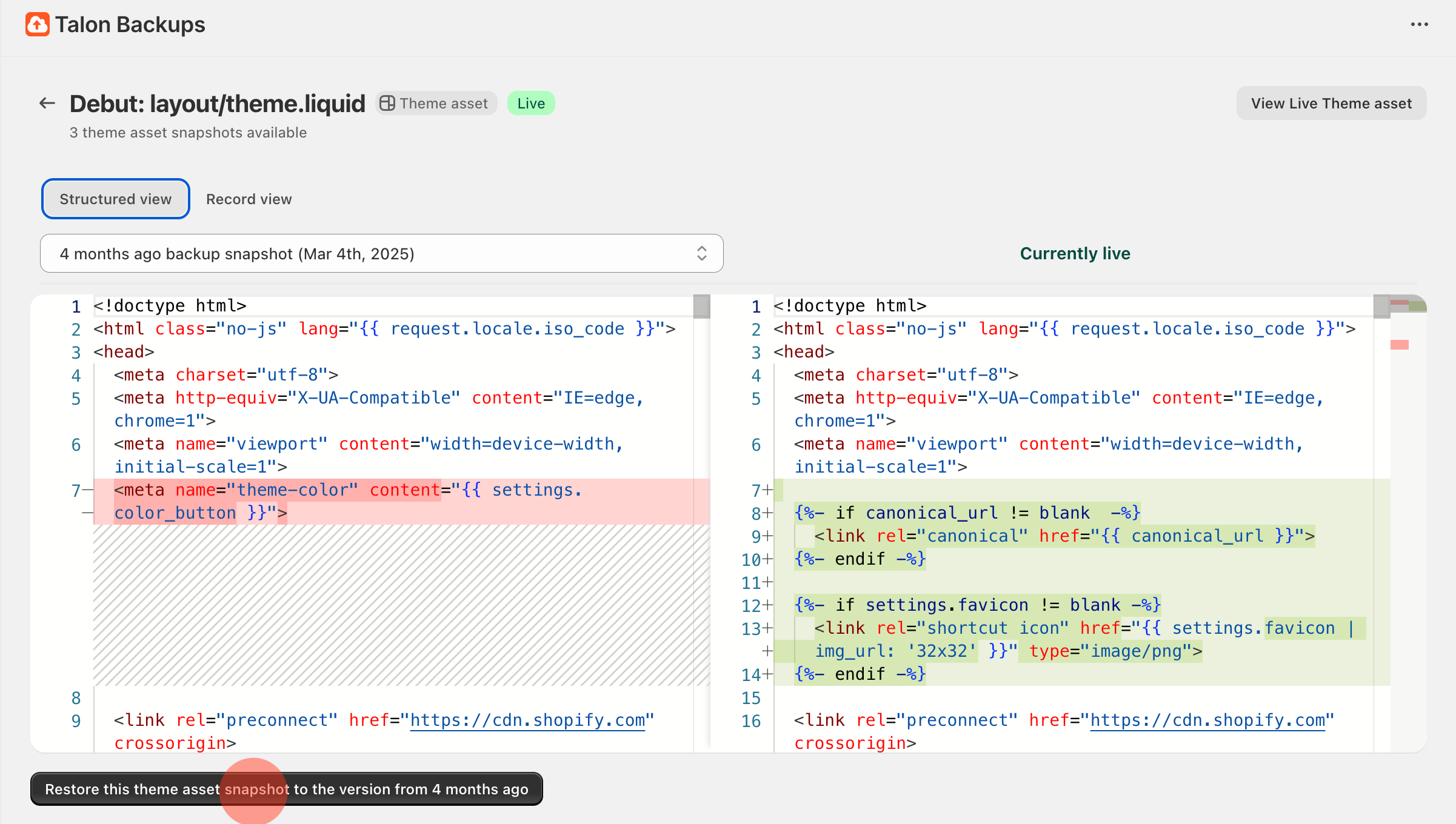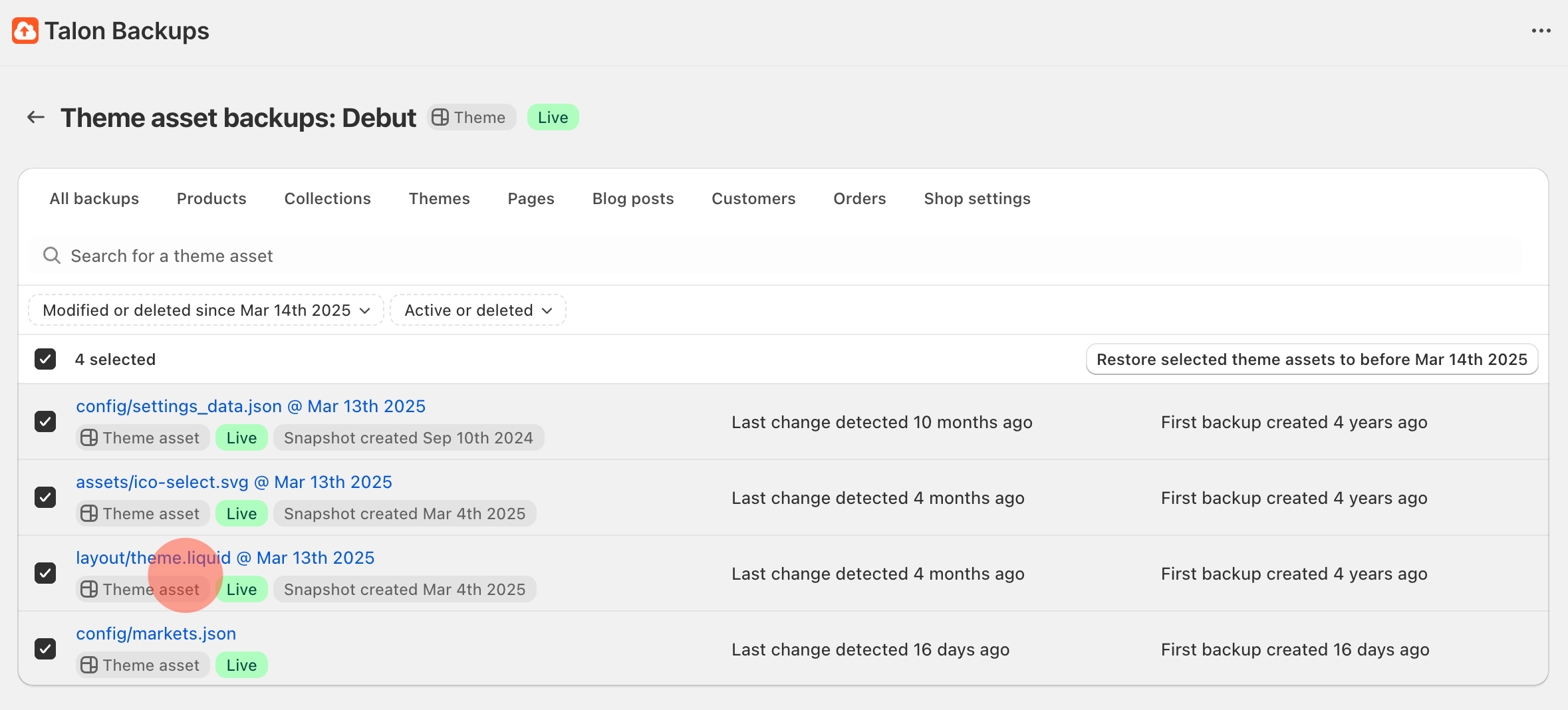 Talon Backups automatically saves daily snapshots and keeps a timeline of changes to your store's data: themes, products, collections, orders, customers, and more. Review how your store's content and data change over time. Make changes to your store with confidence, knowing you can undo them at any time - in just a few clicks.